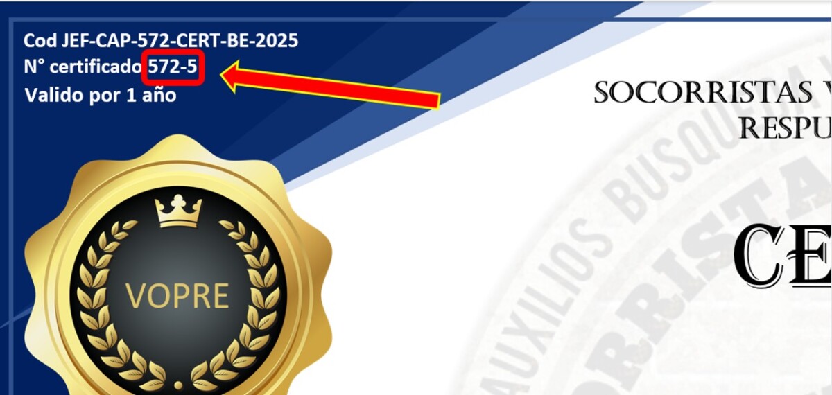Mediante la colocación del CODIGO de certificado, podrás validar la veracidad del documento legal, emitido por la organización VOPRE, acreditando al poseedor del documento, haber llevado el proceso formativo que señala.